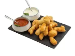 Nodini fritti accompagnati da salsa di pomodoro campano e stracciatella di bufala.